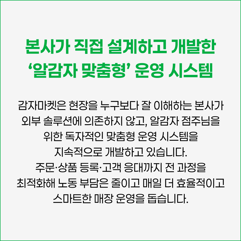 알감자 점주님을 위한 독자적인 맞춤형 운영 시스템을 지속적으로 개발하고 있습니다.