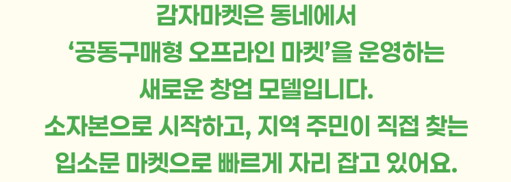 감자마켓은 동네에서 ‘공동구매형 오프라인 마켓’을 운영하는 새로운 창업 모델입니다.