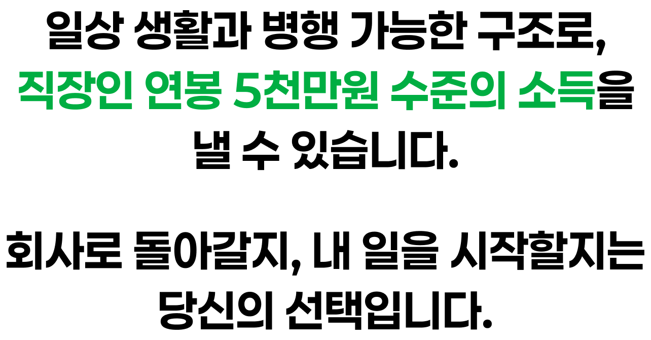 일상 생활과 병행 가능한 구조로, 직장인 연봉 5천만원 수준의 소득을 낼 수 있습니다.